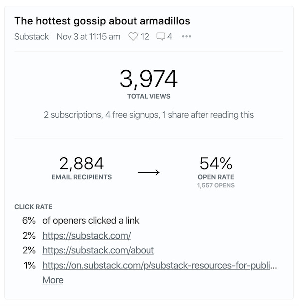 Writers with smaller email lists but consistently high engagement are in a great place to keep growing their list and eventually add paid subscriptions.