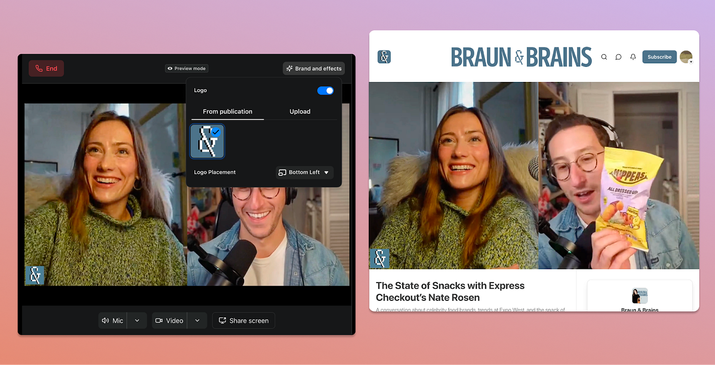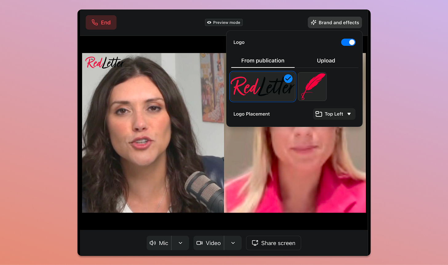 Hosts can now add a publication logo or wordmark directly into any show they record on Substack, whether it’s live or in the Studio. You can adjust it to appear in the top left, top right, or bottom left of the frame, and can also upload a custom asset if you want to add something specific to a show. This is the first step toward giving every show on Substack its own distinct look and feel.