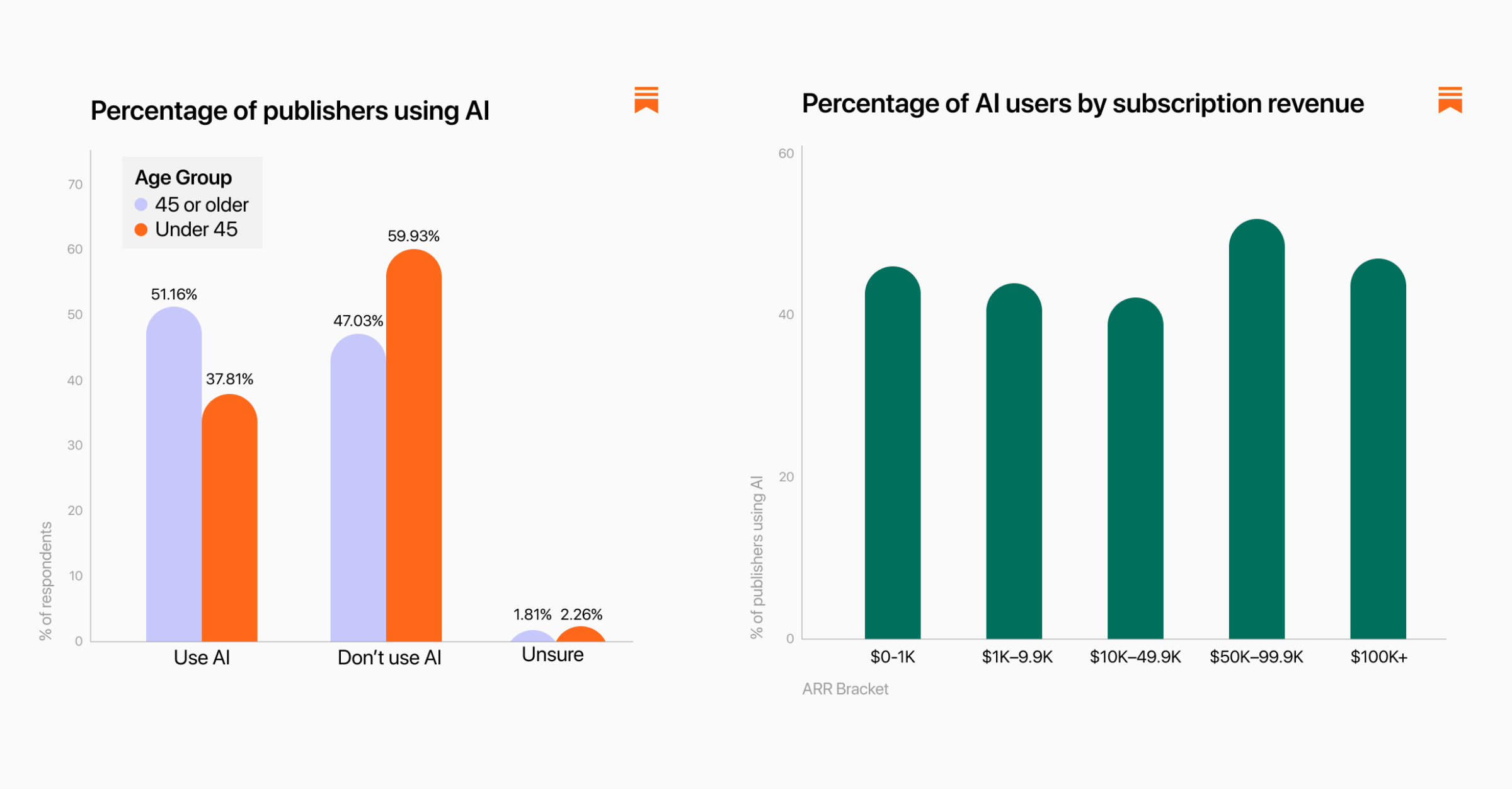 Among publishers earning over $50,000 annually, responses carried a higher margin of error. But AI usage remained close to consistent across revenue levels in the survey response pool.