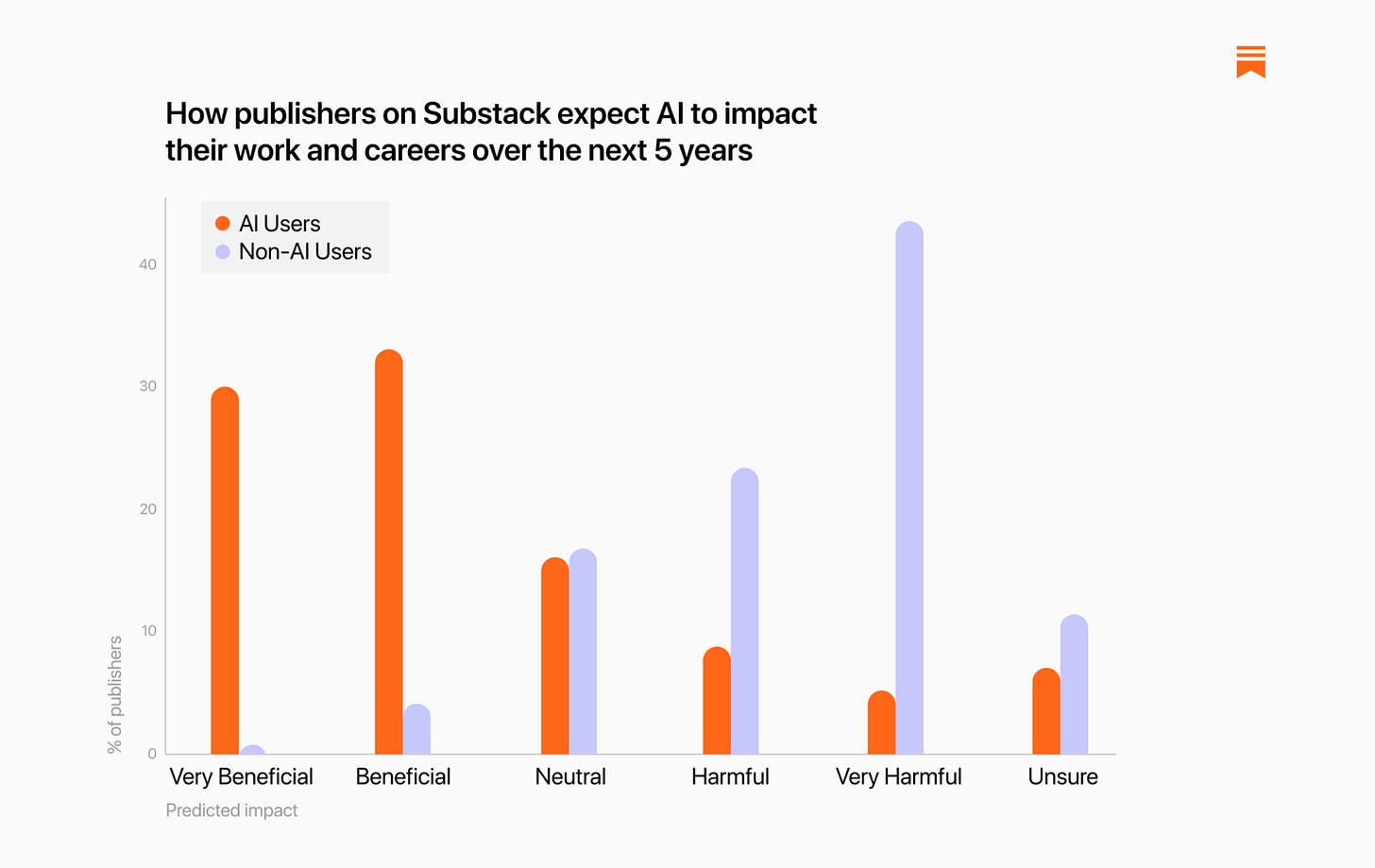 Although these findings are not perfectly weighted to reflect the full Substack publisher base, the results offer directional insight into how different categories of publishers are bringing AI into their work.