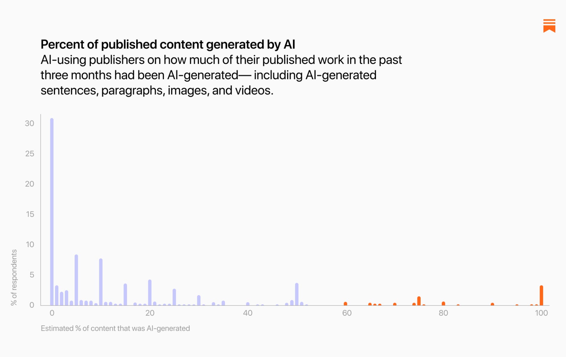 When AI-using publishers were asked to estimate how much of their published content in the past three months had been AI-generated, “including AI-generated sentences, paragraphs, images, and videos,” most reported that they hadn’t used generative AI at all, or used it sparingly—though there is a small cohort that reported using it in 100% of their posts.